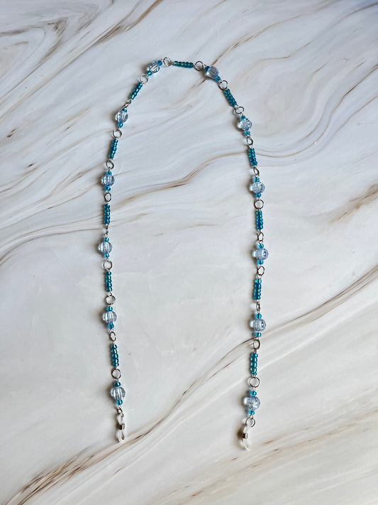 Cadena para gafas con cuentas azules y plateadas.