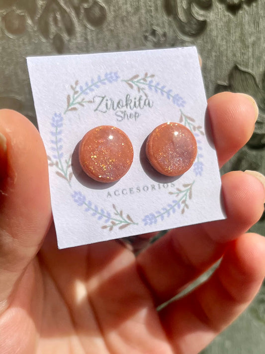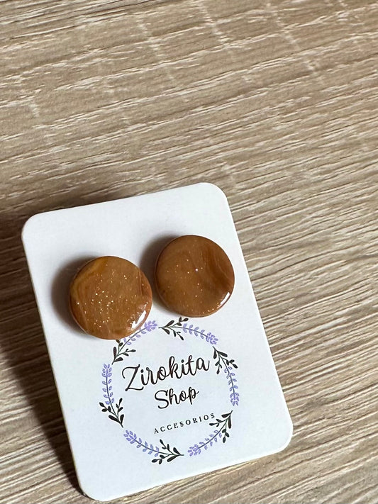 Pendientes pequeños de arcilla polimerica estampado marrón brillante.